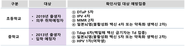 이를 위해 질병관리청은 교육부(장관 최교진)와 협력하여 2001년부터 매년 초·중학교 입학생의 필수예방접종 기록을 확인하고 접종 완료를 권고하는 사업을 수행 중이다(붙임 1 참고).